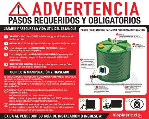 Los estanques deben ser instalados sobre una base plana nivelada sin piedras ni imperfecciones, debe soportar el peso total del estanque (incluido el líquido). Colocar siempre uniones flexibles, en caso de salidas con elementos pesados emplear apoyo empotrado al suelo. Almacenar líquidos con temperatura máxima inferior a 50 ºC. Vea también versiones REFORZADAS y EXTRA REFORZADAS.